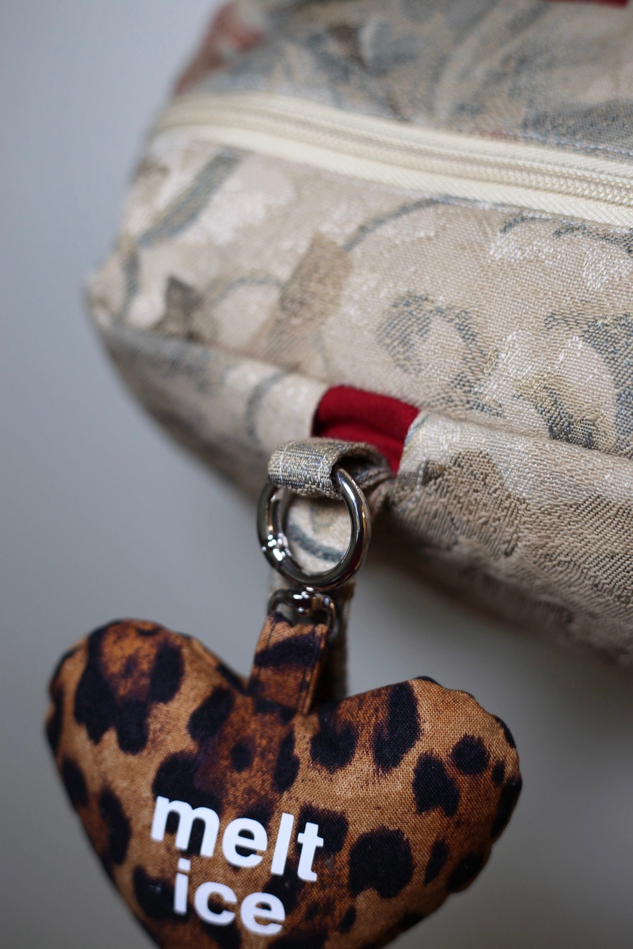 This bowler bag purse was made out of a floral curtain (outside fabric) and a red cotton bedsheet (inner lining). It has a double zipper opening, two charm loops, two inside pockets and accordion tabs on either side to stop the bag from falling flat when opened. This purse was handmade with love and good intentions